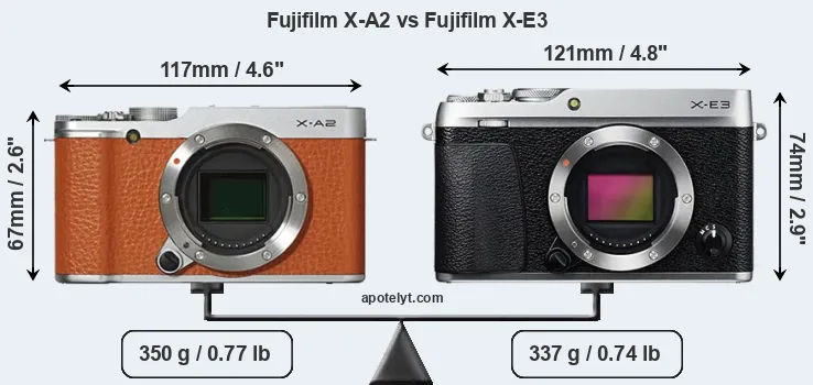 The physical size and weight of the Fujifilm X-A2 and the Fujifilm X-E3 are illustrated in the side-by-side display below. The two cameras are presented according to their relative size. Three consecutive views from the front, the top, and the rear side are shown. All size dimensions are rounded to the nearest millimeter.