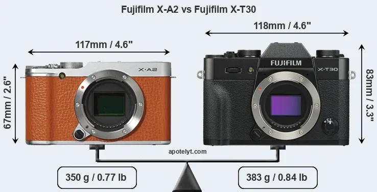 An illustration of the physical size and weight of the Fujifilm X-A2 and the Fujifilm X-T30 is provided in the side-by-side display below. The two cameras are presented according to their relative size. Three consecutive views from the front, the top, and the rear side are shown. All width, height and depth dimensions are rounded to the nearest millimeter.