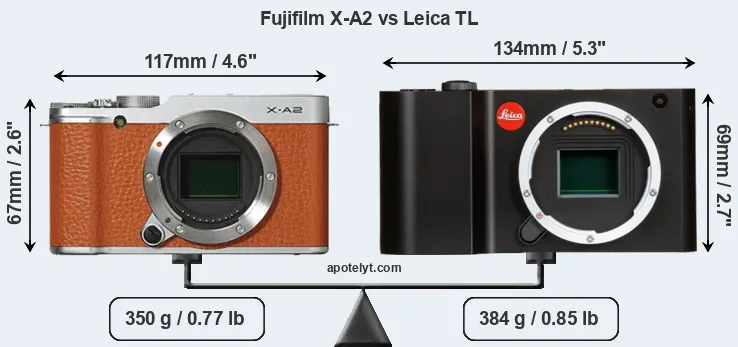 The side-by-side display below illustrates the physical size and weight of the Fujifilm X-A2 and the Leica TL. The two cameras are presented according to their relative size. Three successive views from the front, the top, and the rear are shown. All width, height and depth dimensions are rounded to the nearest millimeter.