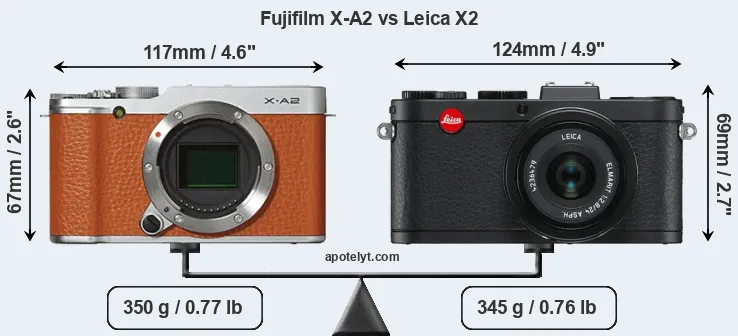 The side-by-side display below illustrates the physical size and weight of the Fujifilm X-A2 and the Leica X2. The two cameras are presented according to their relative size. Three successive views from the front, the top, and the rear are shown. All width, height and depth dimensions are rounded to the nearest millimeter.