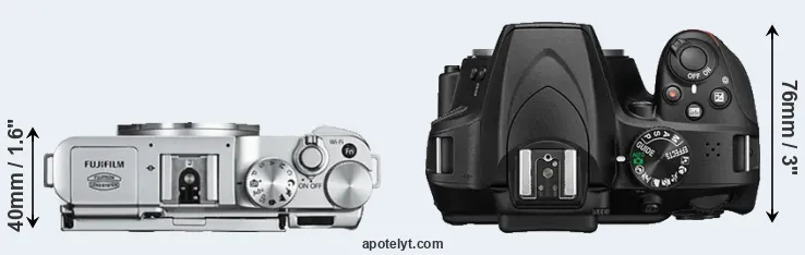 The side-by-side display below illustrates the physical size and weight of the Fujifilm X-A2 and the Nikon D3400. The two cameras are presented according to their relative size. Three consecutive views from the front, the top, and the rear side are shown. All width, height and depth dimensions are rounded to the nearest millimeter.