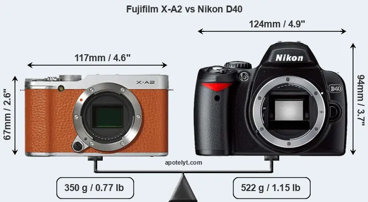 The physical size and weight of the Fujifilm X-A2 and the Nikon D40 are illustrated in the side-by-side display below. The two cameras are presented according to their relative size. Three successive views from the front, the top, and the rear are shown. All width, height and depth measures are rounded to the nearest millimeter.