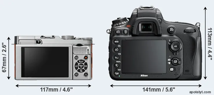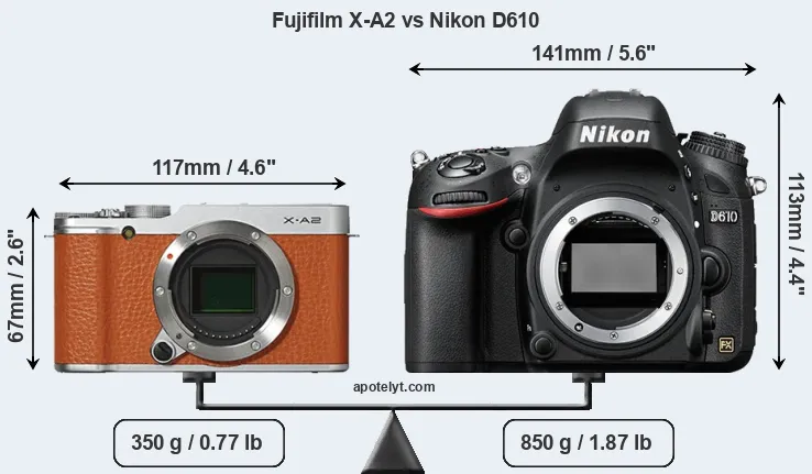 The physical size and weight of the Fujifilm X-A2 and the Nikon D610 are illustrated in the side-by-side display below. The two cameras are presented according to their relative size. Three consecutive perspectives from the front, the top, and the back are available. All width, height and depth measures are rounded to the nearest millimeter.