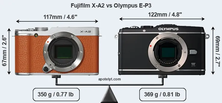 If the front view area (width x height) of the cameras is taken as an aggregate measure of their size, the Olympus E-P3 is notably larger (7 percent) than the Fujifilm X-A2. Moreover, the E-P3 is markedly heavier (5 percent) than the X-A2. In this context, it is worth noting that neither the X-A2 nor the E-P3 are weather-sealed.