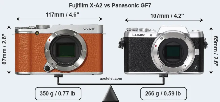 The physical size and weight of the Fujifilm X-A2 and the Panasonic GF7 are illustrated in the side-by-side display below. The two cameras are presented according to their relative size. Three successive views from the front, the top, and the rear are shown. All width, height and depth measures are rounded to the nearest millimeter.