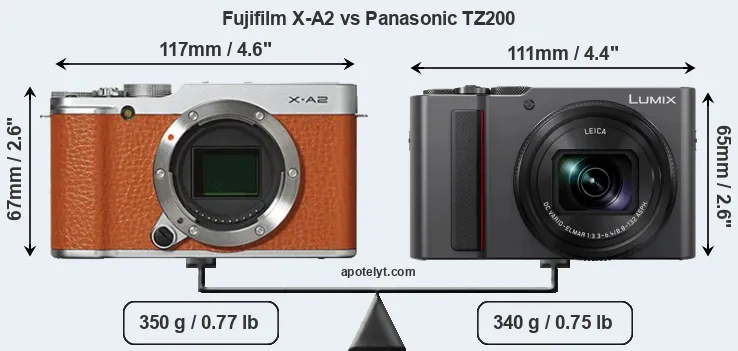 The physical size and weight of the Fujifilm X-A2 and the Panasonic TZ200 are illustrated in the side-by-side display below. The two cameras are presented according to their relative size. Three successive views from the front, the top, and the rear are shown. All width, height and depth measures are rounded to the nearest millimeter.