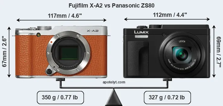 An illustration of the physical size and weight of the Fujifilm X-A2 and the Panasonic ZS80 is provided in the side-by-side display below. The two cameras are presented according to their relative size. Three consecutive views from the front, the top, and the rear side are shown. All width, height and depth dimensions are rounded to the nearest millimeter.