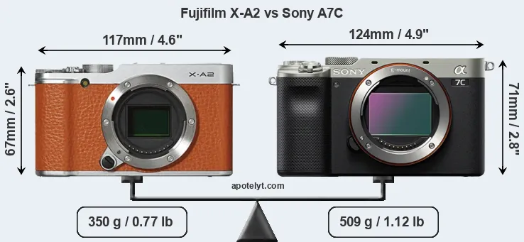 The side-by-side display below illustrates the physical size and weight of the Fujifilm X-A2 and the Sony A7C. The two cameras are presented according to their relative size. Three consecutive perspectives from the front, the top, and the back are available. All width, height and depth measures are rounded to the nearest millimeter.