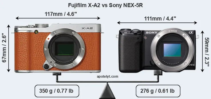 If the front view area (width x height) of the cameras is taken as an aggregate measure of their size, the Sony NEX-5R is notably smaller (16 percent) than the Fujifilm X-A2. Moreover, the NEX-5R is markedly lighter (21 percent) than the X-A2. In this context, it is worth noting that neither the X-A2 nor the NEX-5R are weather-sealed.