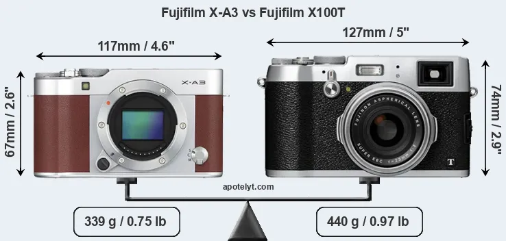 The above size and weight comparisons are to some extent incomplete and possibly misleading, as the X100T has a lens built in, whereas the X-A3 is an interchangeable lens camera that requires a separate lens. Attaching the latter will add extra weight and bulk to the setup. You can compare the optics available for the X-A3 and their specifications in the Fujinon X Lens Catalog.