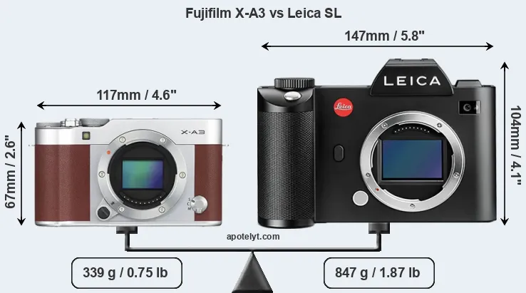 If the front view area (width x height) of the cameras is taken as an aggregate measure of their size, the Leica SL is considerably larger (95 percent) than the Fujifilm X-A3. Moreover, the Leica SL is substantially heavier (150 percent) than the X-A3. It is noteworthy in this context that the Leica SL is splash and dust-proof, while the X-A3 does not feature any corresponding weather-sealing.