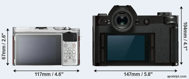 The side-by-side display below illustrates the physical size and weight of the Fujifilm X-A3 and the Leica SL. The two cameras are presented according to their relative size. Three consecutive views from the front, the top, and the rear side are shown. All width, height and depth dimensions are rounded to the nearest millimeter.