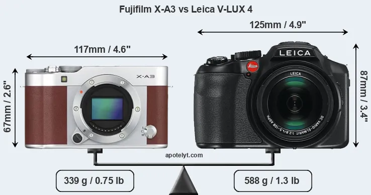 The above size and weight comparisons are to some extent incomplete and possibly misleading, as the V-LUX 4 has a lens built in, whereas the X-A3 is an interchangeable lens camera that requires a separate lens. Attaching the latter will add extra weight and bulk to the setup. You can compare the optics available for the X-A3 and their specifications in the Fujinon X Lens Catalog.