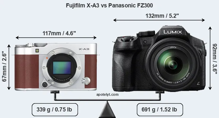 An illustration of the physical size and weight of the Fujifilm X-A3 and the Panasonic FZ300 is provided in the side-by-side display below. The two cameras are presented according to their relative size. Three successive views from the front, the top, and the rear are shown. All width, height and depth measures are rounded to the nearest millimeter.