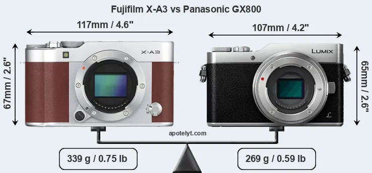 An illustration of the physical size and weight of the Fujifilm X-A3 and the Panasonic GX800 is provided in the side-by-side display below. The two cameras are presented according to their relative size. Three successive views from the front, the top, and the rear are shown. All width, height and depth dimensions are rounded to the nearest millimeter.