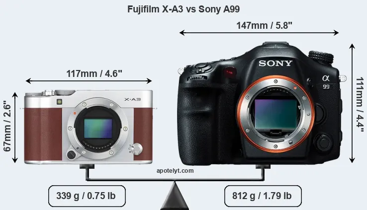 If the front view area (width x height) of the cameras is taken as an aggregate measure of their size, the Sony A99 is considerably larger (108 percent) than the Fujifilm X-A3. Moreover, the A99 is substantially heavier (140 percent) than the X-A3. It is noteworthy in this context that the A99 is splash and dust-proof, while the X-A3 does not feature any corresponding weather-sealing.