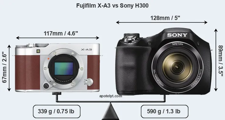 The side-by-side display below illustrates the physical size and weight of the Fujifilm X-A3 and the Sony H300. The two cameras are presented according to their relative size. Three consecutive views from the front, the top, and the rear side are shown. All width, height and depth dimensions are rounded to the nearest millimeter.