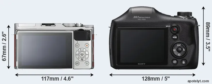 If the front view area (width x height) of the cameras is taken as an aggregate measure of their size, the Sony H300 is considerably larger (45 percent) than the Fujifilm X-A3. In this context, it is worth noting that neither the X-A3 nor the H300 are weather-sealed.