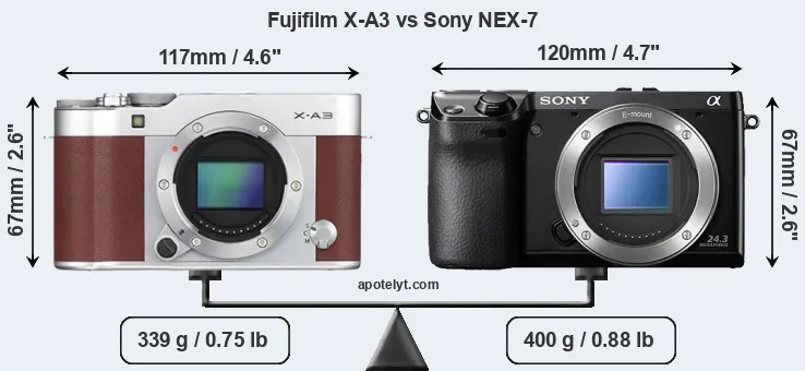 If the front view area (width x height) of the cameras is taken as an aggregate measure of their size, the Sony NEX-7 is somewhat larger (3 percent) than the Fujifilm X-A3. Moreover, the NEX-7 is markedly heavier (18 percent) than the X-A3. In this context, it is worth noting that neither the X-A3 nor the NEX-7 are weather-sealed.