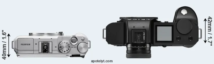 The side-by-side display below illustrates the physical size and weight of the Fujifilm X-A5 and the Leica SL2. The two cameras are presented according to their relative size. Three successive views from the front, the top, and the rear are shown. All width, height and depth dimensions are rounded to the nearest millimeter.