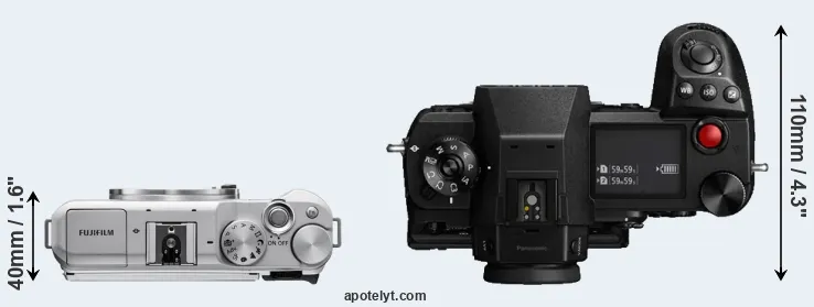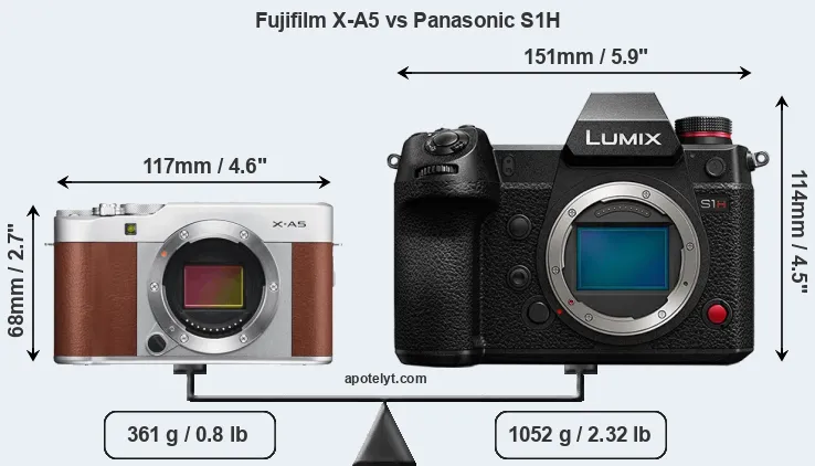The side-by-side display below illustrates the physical size and weight of the Fujifilm X-A5 and the Panasonic S1H. The two cameras are presented according to their relative size. Three successive views from the front, the top, and the rear are shown. All width, height and depth dimensions are rounded to the nearest millimeter.