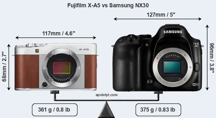 The side-by-side display below illustrates the physical size and weight of the Fujifilm X-A5 and the Samsung NX30. The two cameras are presented according to their relative size. Three consecutive perspectives from the front, the top, and the back are available. All width, height and depth dimensions are rounded to the nearest millimeter.