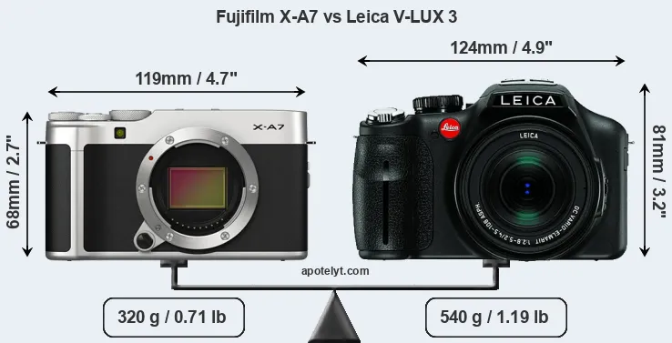 The side-by-side display below illustrates the physical size and weight of the Fujifilm X-A7 and the Leica V-LUX 3. The two cameras are presented according to their relative size. Three consecutive perspectives from the front, the top, and the back are available. All width, height and depth measures are rounded to the nearest millimeter.
