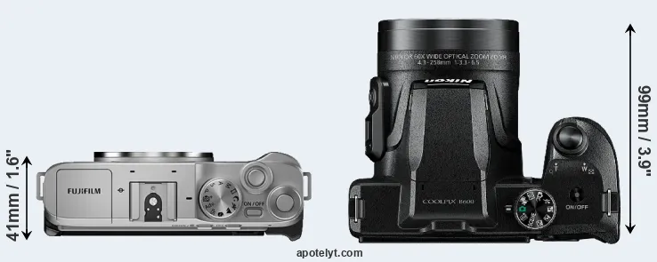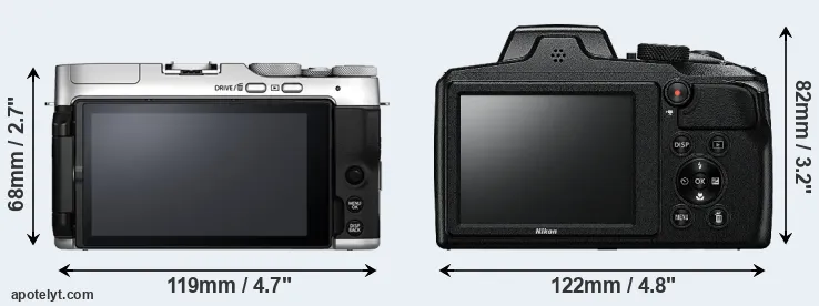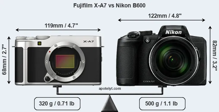 The physical size and weight of the Fujifilm X-A7 and the Nikon B600 are illustrated in the side-by-side display below. The two cameras are presented according to their relative size. Three consecutive perspectives from the front, the top, and the back are available. All width, height and depth dimensions are rounded to the nearest millimeter.