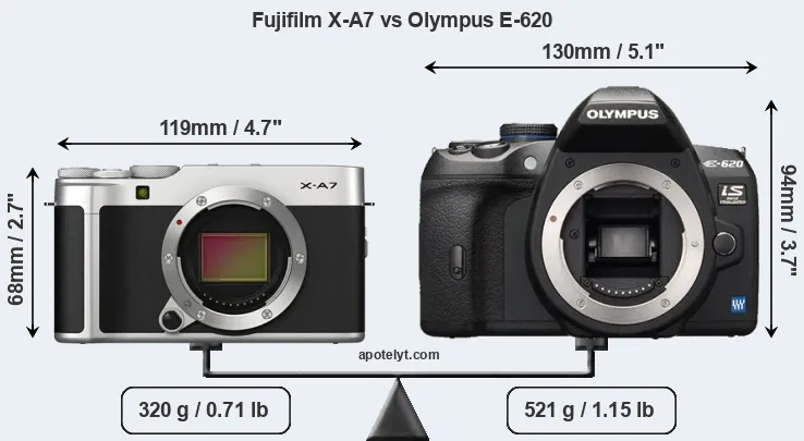 If the front view area (width x height) of the cameras is taken as an aggregate measure of their size, the Olympus E-620 is considerably larger (51 percent) than the Fujifilm X-A7. Moreover, the E-620 is substantially heavier (63 percent) than the X-A7. In this context, it is worth noting that neither the X-A7 nor the E-620 are weather-sealed.