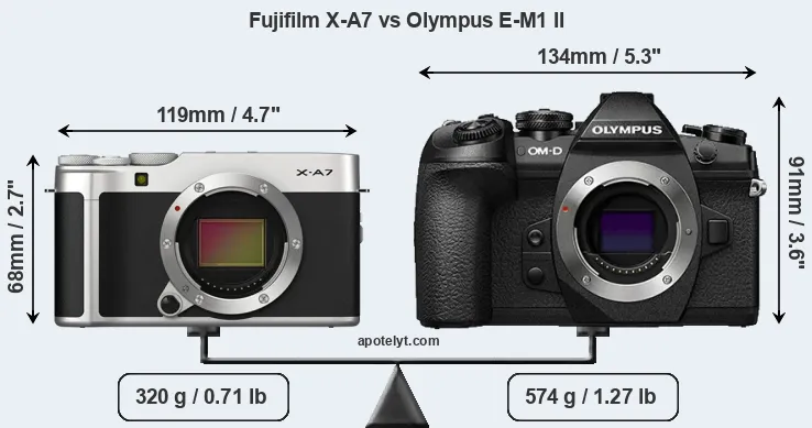 If the front view area (width x height) of the cameras is taken as an aggregate measure of their size, the Olympus E-M1 II is considerably larger (51 percent) than the Fujifilm X-A7. Moreover, the E-M1 II is substantially heavier (79 percent) than the X-A7. It is noteworthy in this context that the E-M1 II is splash and dust-proof, while the X-A7 does not feature any corresponding weather-sealing.