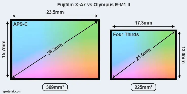 Of the two cameras under consideration, the Fujifilm X-A7 features an APS-C sensor and the Olympus E-M1 II a Four Thirds sensor. The sensor area in the E-M1 II is 39 percent smaller. As a result of these sensor size differences, the cameras have a format factor of, respectively, 1.5 and 2.0. The sensor in the X-A7 has a native 3:2 aspect ratio, while the one in the E-M1 II offers a 4:3 aspect.