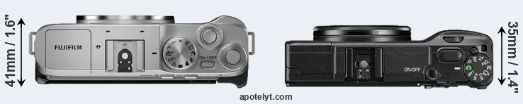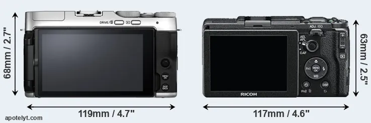 The physical size and weight of the Fujifilm X-A7 and the Ricoh GR II are illustrated in the side-by-side display below. The two cameras are presented according to their relative size. Three successive views from the front, the top, and the rear are shown. All width, height and depth dimensions are rounded to the nearest millimeter.