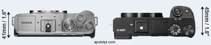 An illustration of the physical size and weight of the Fujifilm X-A7 and the Sony A6000 is provided in the side-by-side display below. The two cameras are presented according to their relative size. Three successive views from the front, the top, and the rear are shown. All width, height and depth dimensions are rounded to the nearest millimeter.