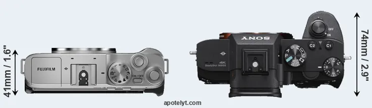 The physical size and weight of the Fujifilm X-A7 and the Sony A7 III are illustrated in the side-by-side display below. The two cameras are presented according to their relative size. Three successive views from the front, the top, and the rear are shown. All width, height and depth measures are rounded to the nearest millimeter.