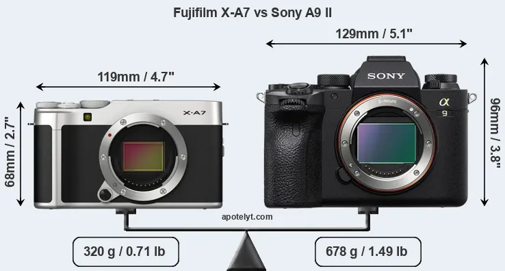 If the front view area (width x height) of the cameras is taken as an aggregate measure of their size, the Sony A9 II is considerably larger (53 percent) than the Fujifilm X-A7. Moreover, the A9 II is substantially heavier (112 percent) than the X-A7. It is noteworthy in this context that the A9 II is splash and dust-proof, while the X-A7 does not feature any corresponding weather-sealing.