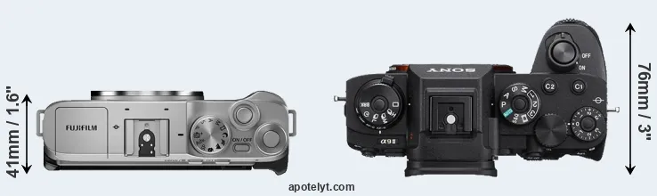 The physical size and weight of the Fujifilm X-A7 and the Sony A9 II are illustrated in the side-by-side display below. The two cameras are presented according to their relative size. Three successive views from the front, the top, and the rear are shown. All width, height and depth measures are rounded to the nearest millimeter.