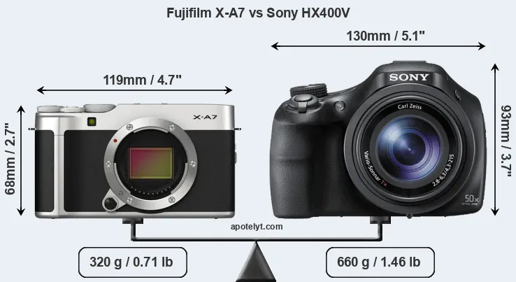 The above size and weight comparisons are to some extent incomplete and possibly misleading, as the HX400V has a lens built in, whereas the X-A7 is an interchangeable lens camera that requires a separate lens. Attaching the latter will add extra weight and bulk to the setup. You can compare the optics available for the X-A7 and their specifications in the Fujinon X Lens Catalog.