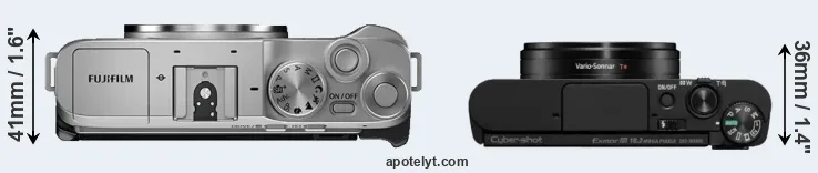 The side-by-side display below illustrates the physical size and weight of the Fujifilm X-A7 and the Sony WX800. The two cameras are presented according to their relative size. Three consecutive views from the front, the top, and the rear side are shown. All width, height and depth dimensions are rounded to the nearest millimeter.