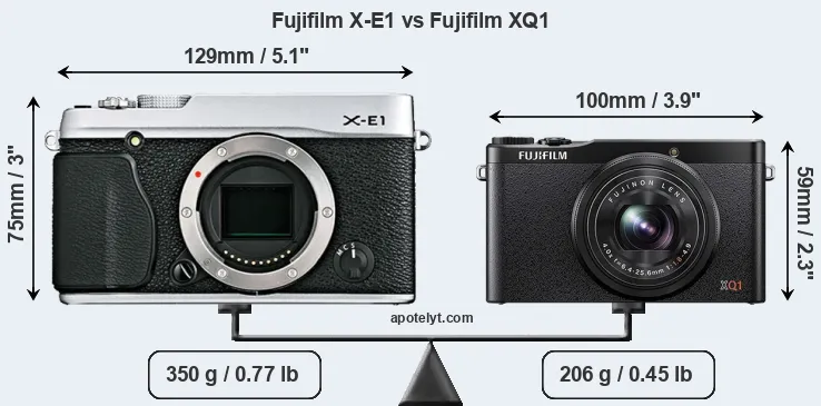 The physical size and weight of the Fujifilm X-E1 and the Fujifilm XQ1 are illustrated in the side-by-side display below. The two cameras are presented according to their relative size. Three consecutive perspectives from the front, the top, and the back are available. All size dimensions are rounded to the nearest millimeter.