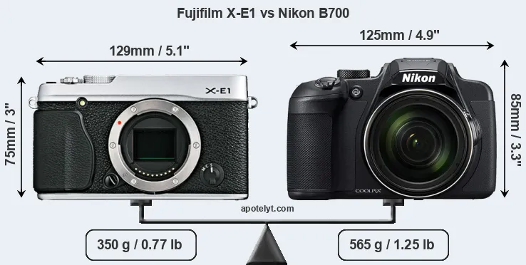 The side-by-side display below illustrates the physical size and weight of the Fujifilm X-E1 and the Nikon B700. The two cameras are presented according to their relative size. Three consecutive views from the front, the top, and the rear side are shown. All width, height and depth dimensions are rounded to the nearest millimeter.