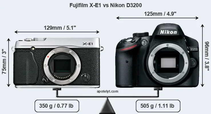 An illustration of the physical size and weight of the Fujifilm X-E1 and the Nikon D3200 is provided in the side-by-side display below. The two cameras are presented according to their relative size. Three consecutive perspectives from the front, the top, and the back are available. All width, height and depth measures are rounded to the nearest millimeter.