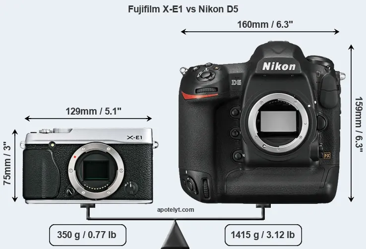If the front view area (width x height) of the cameras is taken as an aggregate measure of their size, the Nikon D5 is considerably larger (163 percent) than the Fujifilm X-E1. Moreover, the D5 is substantially heavier (304 percent) than the X-E1. It is noteworthy in this context that the D5 is splash and dust-proof, while the X-E1 does not feature any corresponding weather-sealing.