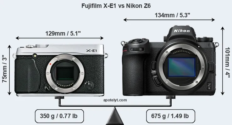 An illustration of the physical size and weight of the Fujifilm X-E1 and the Nikon Z6 is provided in the side-by-side display below. The two cameras are presented according to their relative size. Three successive views from the front, the top, and the rear are shown. All width, height and depth dimensions are rounded to the nearest millimeter.