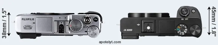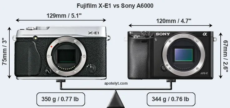 An illustration of the physical size and weight of the Fujifilm X-E1 and the Sony A6000 is provided in the side-by-side display below. The two cameras are presented according to their relative size. Three successive views from the front, the top, and the rear are shown. All size dimensions are rounded to the nearest millimeter.