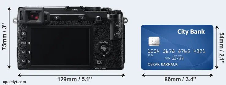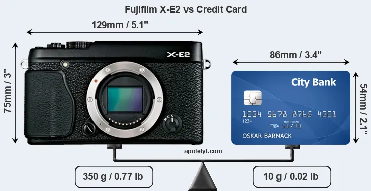 The physical dimensions of the Fujifilm X-E2 relative to a credit card are illustrated in the side-by-side display below. Three consecutive views from the front, the top, and the rear side are shown. All size dimensions are rounded to the nearest millimeter.