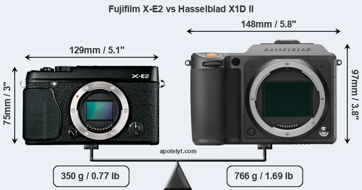 If the front view area (width x height) of the cameras is taken as an aggregate measure of their size, the Hasselblad X1D II is considerably larger (48 percent) than the Fujifilm X-E2. Moreover, the X1D II is substantially heavier (119 percent) than the X-E2. It is noteworthy in this context that the X1D II is splash and dust-proof, while the X-E2 does not feature any corresponding weather-sealing.