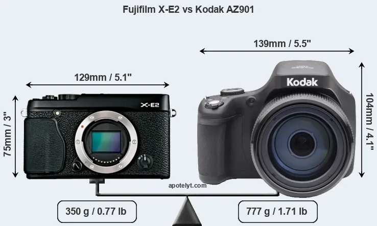 The physical size and weight of the Fujifilm X-E2 and the Kodak AZ901 are illustrated in the side-by-side display below. The two cameras are presented according to their relative size. Three consecutive perspectives from the front, the top, and the back are available. All width, height and depth dimensions are rounded to the nearest millimeter.
