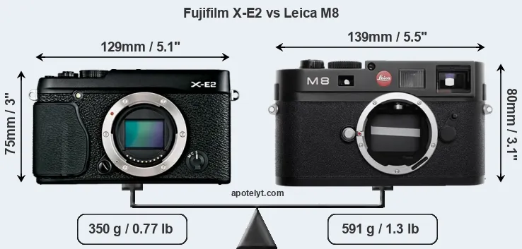 If the front view area (width x height) of the cameras is taken as an aggregate measure of their size, the Leica M8 is notably larger (15 percent) than the Fujifilm X-E2. Moreover, the M8 is substantially heavier (69 percent) than the X-E2. In this context, it is worth noting that neither the X-E2 nor the M8 are weather-sealed.