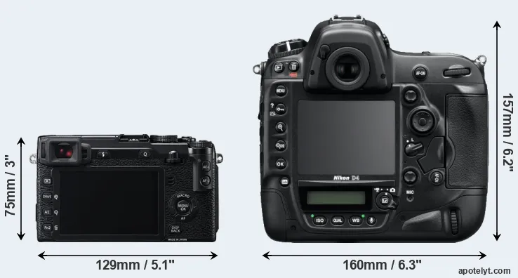 If the front view area (width x height) of the cameras is taken as an aggregate measure of their size, the Nikon D4 is considerably larger (160 percent) than the Fujifilm X-E2. Moreover, the D4 is substantially heavier (283 percent) than the X-E2. It is noteworthy in this context that the D4 is splash and dust-proof, while the X-E2 does not feature any corresponding weather-sealing.