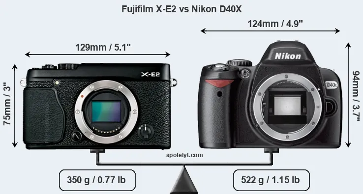 An illustration of the physical size and weight of the Fujifilm X-E2 and the Nikon D40X is provided in the side-by-side display below. The two cameras are presented according to their relative size. Three consecutive perspectives from the front, the top, and the back are available. All width, height and depth dimensions are rounded to the nearest millimeter.